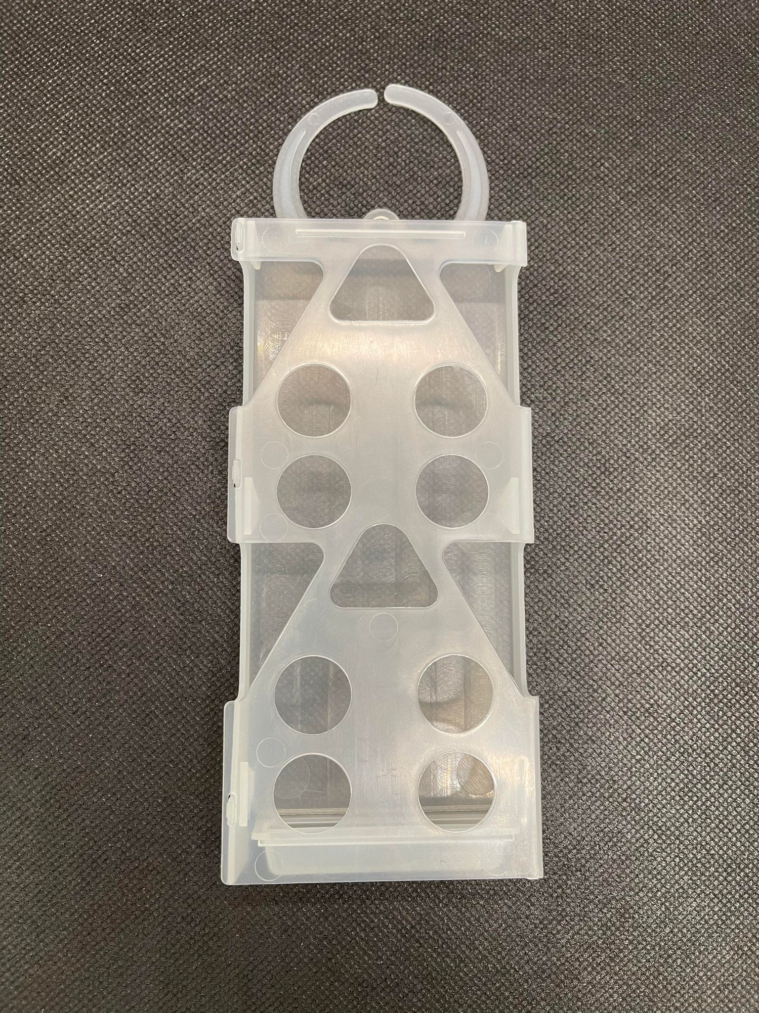 Base plastique polypropylène transparente avec larges entrées pour les mites. Cette base peut facilement être clouée, collée ou suspendue et sert de support à l’attractif.